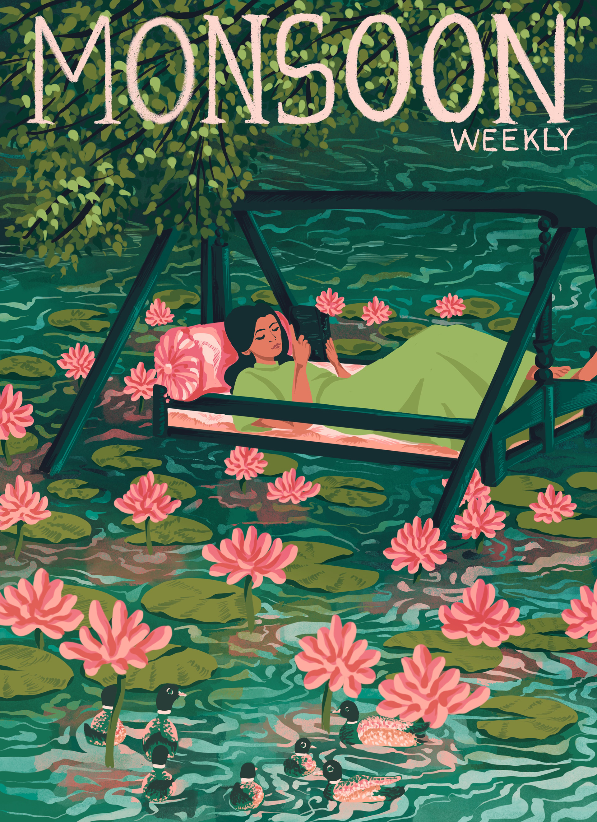 A surreal piece imagining a poetic, dream-soaked cover for Monsoon Weekly. This illustration explores the emotional landscape of the Indian monsoon — not as weather, but as a world. Rendered in a soothing palette and gentle whimsy, a cover that turns everyday monsoon moments into a dreamy escape: familiar and nostlagic - one that takes us back to the leisure only Indian monsoon days can afford.